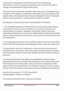 يعبّر الحزب الآشوري الديمقراطي عن رفضه واستنكاره الشديد للقرارات الصادرة عن مؤسسات الإدارة الذاتية في شمال وشرق سوريا، والمتعلقة بإغلاق المدارس الخاصة العائدة للكنائس، أو إلزامها بتدريس المنهاج المعتمد من قبل الإدارة الذاتية، رغم عدم الاعتراف بهذا المنهاج على المستويين الوطني والدولي.