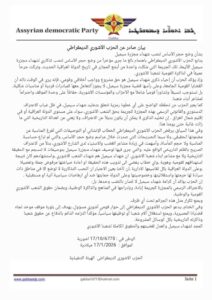 وفي الختام، يدعو الحزب الآشوري الديمقراطي إلى حوار قومي آشوري مسؤول، يهدف إلى بلورة موقف موحّد تجاه قضايانا المصيرية، ويمنع استغلال آلام شعبنا أو توظيفها سياسياً، مؤكداً التزامه الدائم بالدفاع عن حقوق شعبنا وذاكرته التاريخية بكل الوسائل المشروعة.